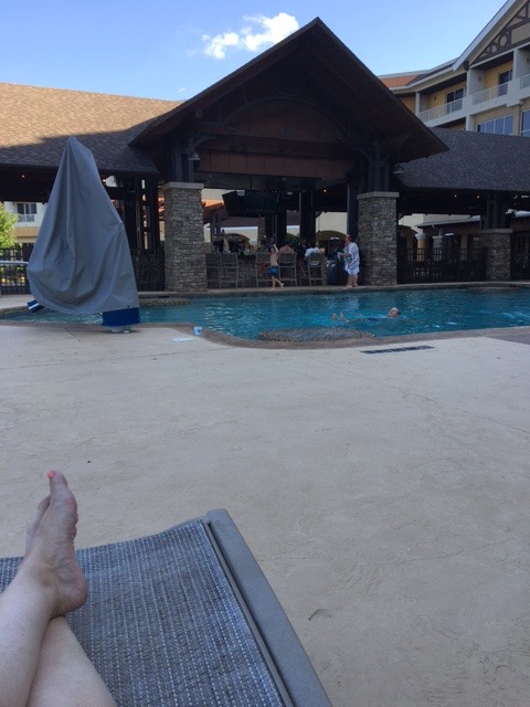 Yesterday we took time out to go to the pool. I actually swam laps! We have three pools in our neighborhood - the heated indoor pool (where I swam), the adult only pool (seen in photo above), and a family pool that has waterfalls, fountains, and a tunnel slide. You can see the splash bar in the picture above - they serve delicious food (brisket burger, anyone?) and have live music every night. Yes, I'm liking our new neighborhood!